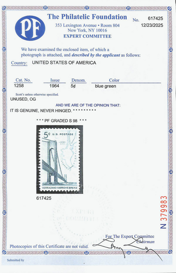5702 nh 1258 image1964, 5¢ Verrazano-Narrows Bridge (Scott 1258), o.g., never hinged, Superb, with 2025 P.F. certificate graded SUP 98.