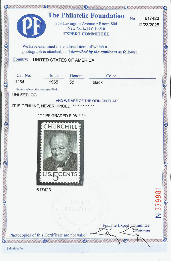 5703 nh 1264 image1965, 5¢ Churchill (Scott 1264), o.g., never hinged, Superb, with 2025 P.F. certificate graded SUP 98.