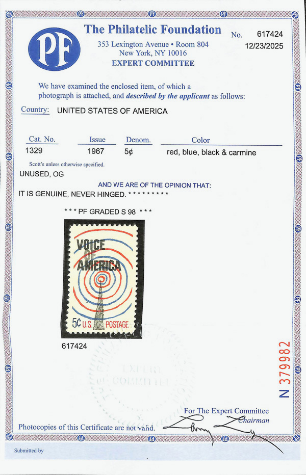 5712 nh 1329 image1967, 5¢ Voice of America (Scott 1329), o.g., never hinged, Superb, with 2025 P.F. certificate graded SUP 98.