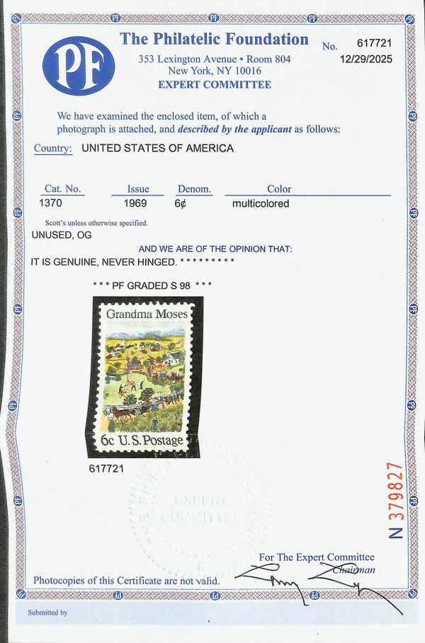 5714 og 1370 image1969, 6¢ Grandma Moses (Scott 1370), Superb no SMQ price, with 2025 P.F. certificate graded SUP 98. (Image) (Image2) (All Images)