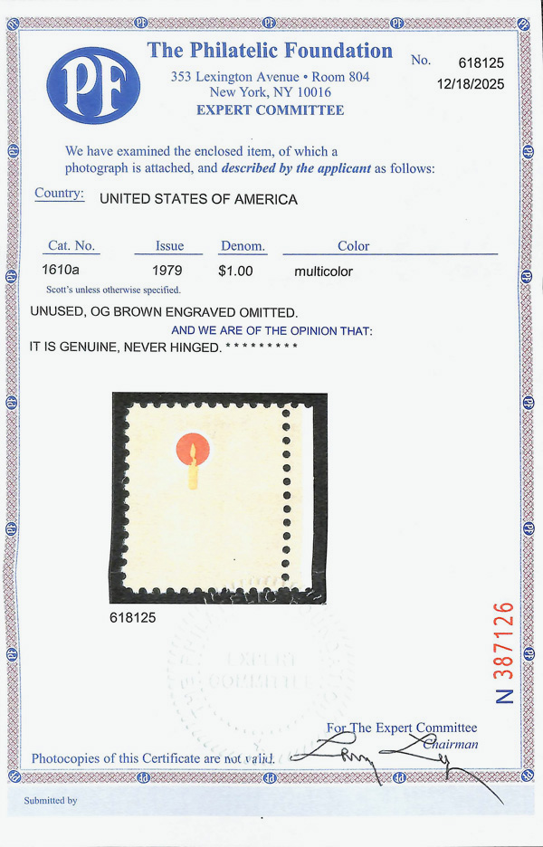 5715 nh 1610a image1979, $1 Rush Lamp, brown (engraved) omitted (Scott 1610a), o.g., never hinged, Extremely Fine, with 2025 P.F. certificate.