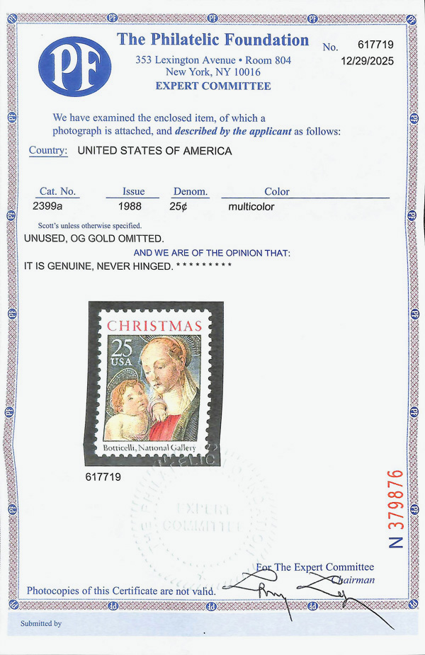 5717 nh 2399a image1988, 25¢ Christmas: Madonna & Child, gold omitted (Scott 2399a), o.g., never hinged, Extremely Fine, with 2025 P.F. certificate.