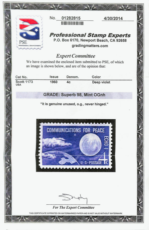 5693 nh 1173 image1960, 4¢ Echo I (Scott 1173), o.g., never hinged, Superb, with 2014 P.S.E. certificate graded SUP 98.