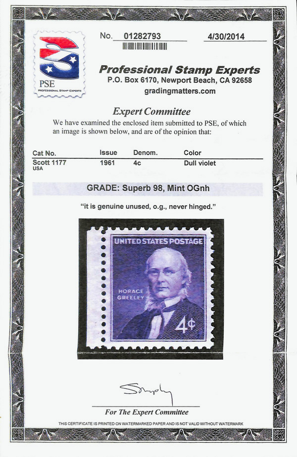 5694 nh 1177 image1961, 4¢ Horace Greeley (Scott 1177), o.g., never hinged, Superb, with 2014 P.S.E. certificate graded SUP 98.