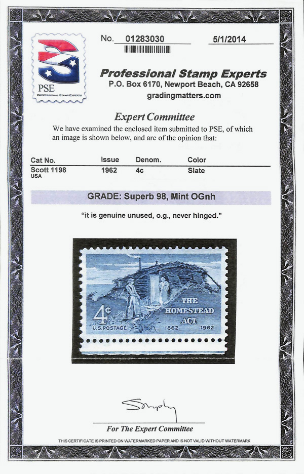 5697 nh 1198 image1962, 4¢ Homestead Act (Scott 1198), o.g., never hinged, Superb, with 2014 P.S.E. certificate graded SUP 98.