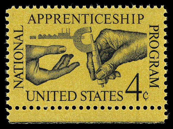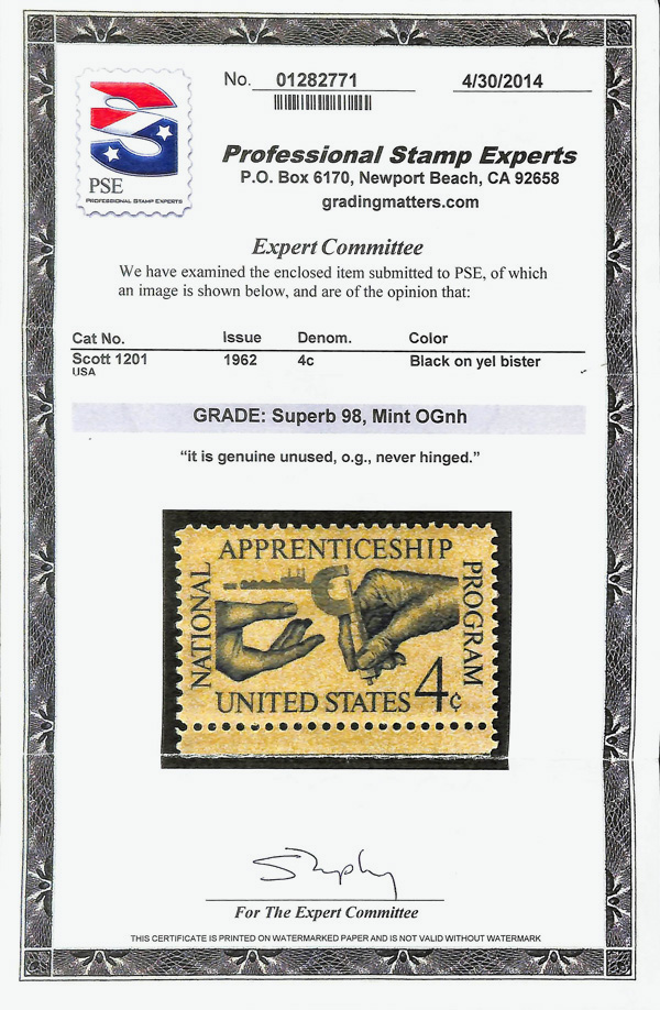 5698 nh 1201 image1962, 4¢ Apprenticeship (Scott 1201), o.g., never hinged, Superb, with 2014 P.S.E. certificate graded SUP 98.