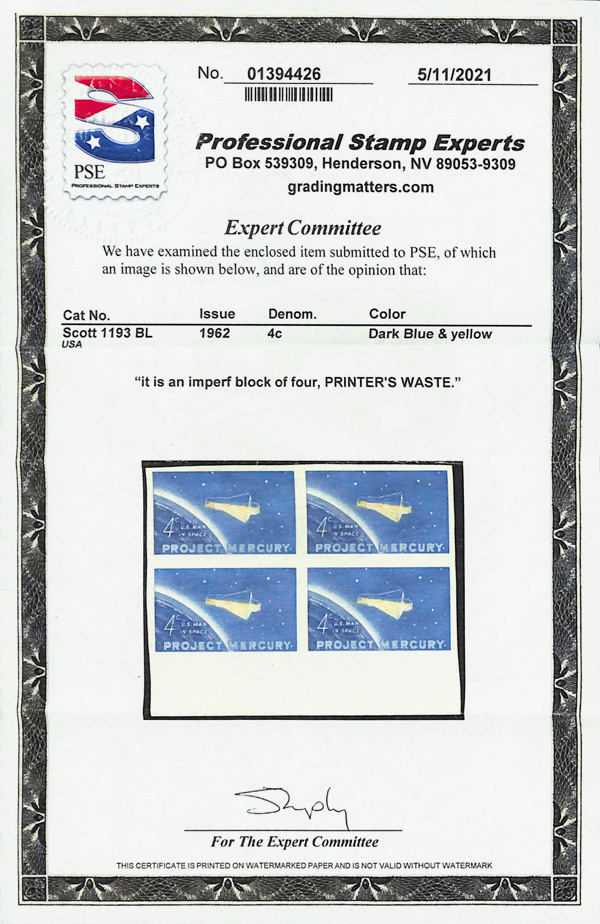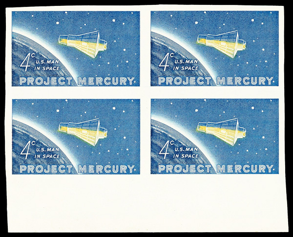 5696 nhbl 1193 image1962, 4¢ Project Mercury (Scott 1193), bottom margin block of 4, Printer's Waste, o.g., never hinged, Very Fine, with 2021 P.S.E. certificate. (Image) (Image2) (All Images)