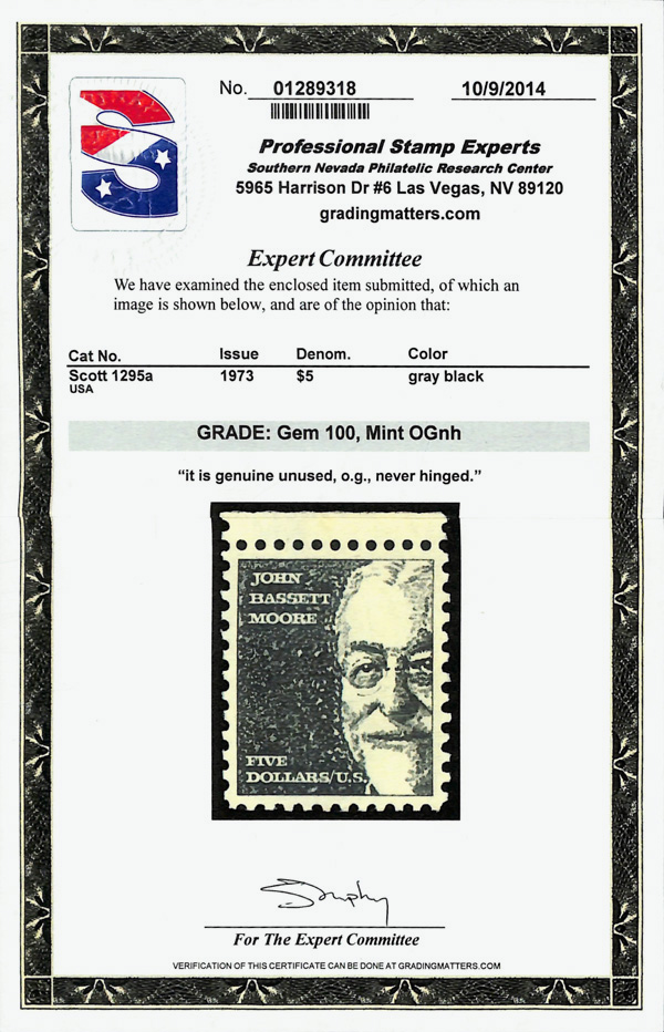 5704 nh 1295a image1973, $5 Moore, tagged (Scott 1295a), o.g., never hinged, Superb, with 2014 P.S.E. certificate graded GEM 100.