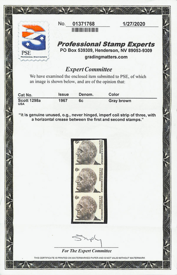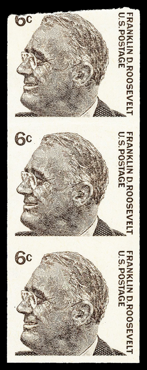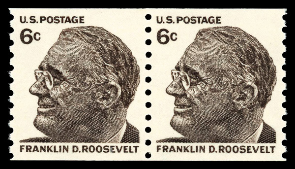 5705 nh 1298a image1967, 6¢ Franklin D. Roosevelt, vertical coil, imperf. pair (Scott 1298a), o.g., never hinged, Extremely Fine, with 2020 P.S.E. certificate.