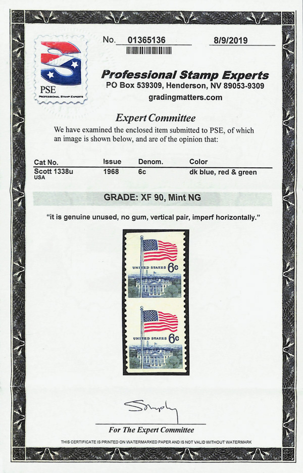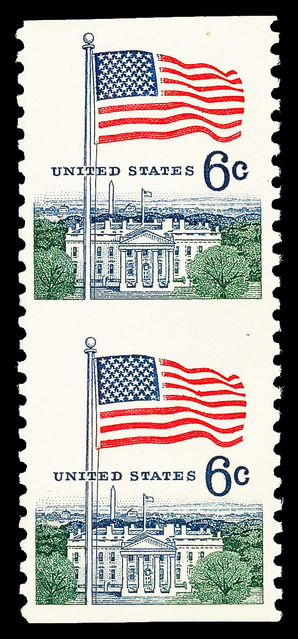 5713 ng 1338u image1968, 6¢ Flag over White House, Giori press printing, vertical pair, imperf horizontally (Scott 1338u), unused without gum, Extremely Fine, less than 50 pairs reported, with 2019 P.S.E. certificate graded XF 90.
