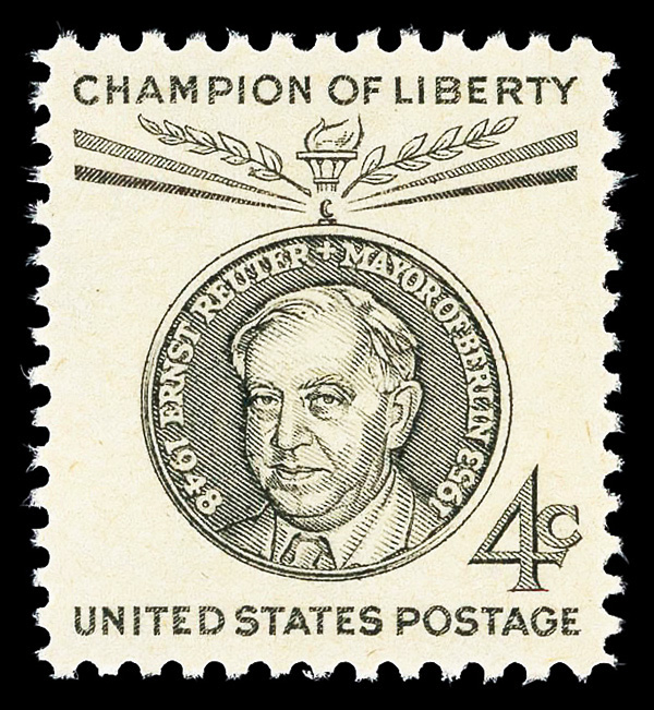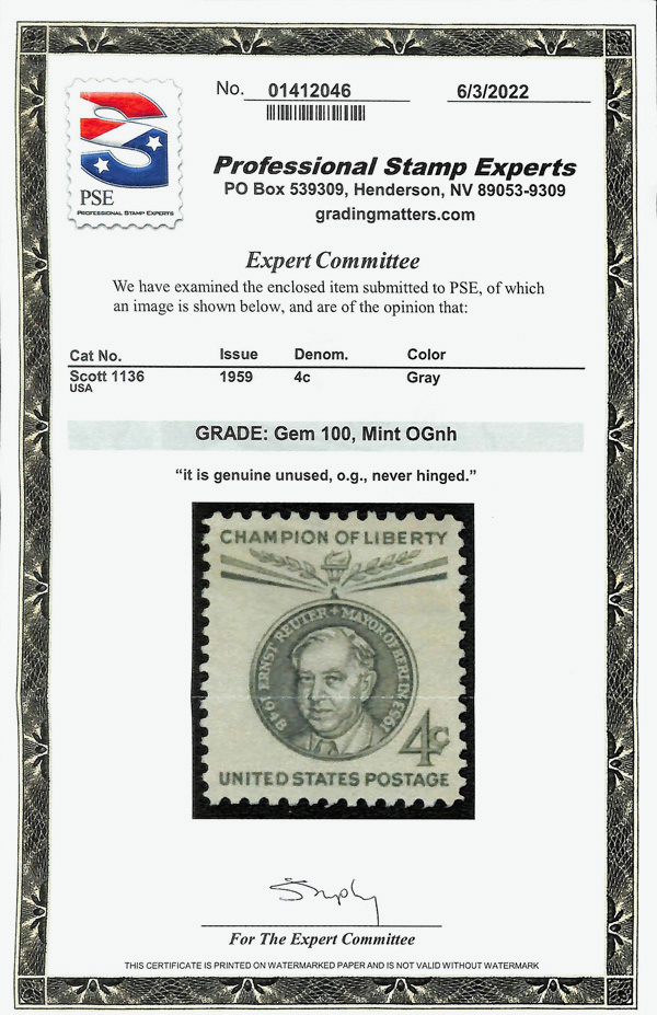 5681 nh 1136 image1959, 4¢ Champion of Liberty: Ernst Reuter (Scott 1136), o.g., never hinged, Superb, with 2022 P.S.E. certificate graded GEM 100.