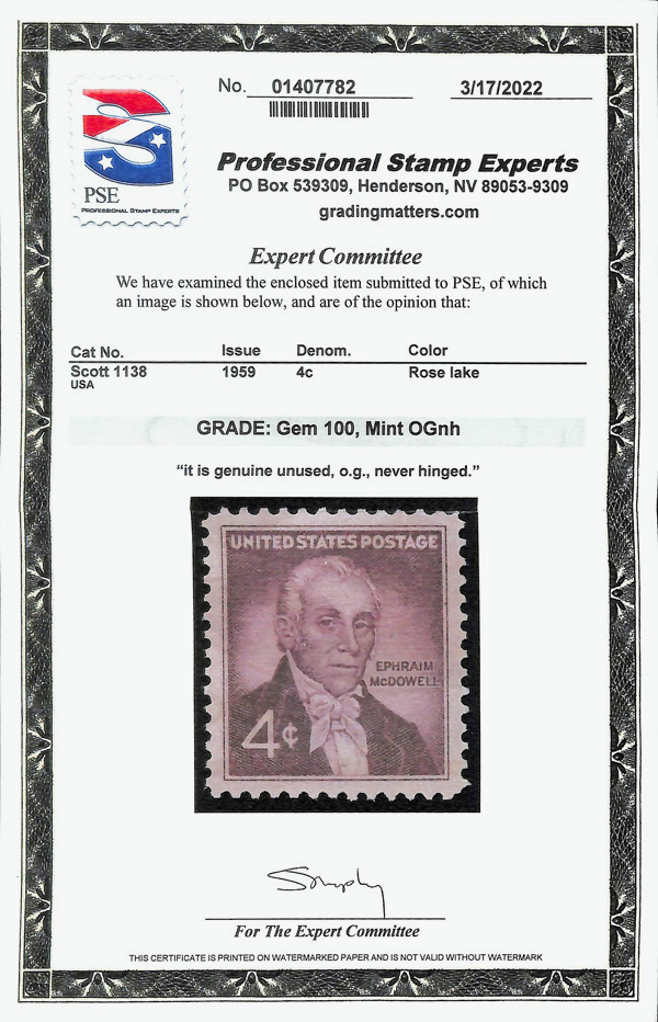 5682 nh 1138 image1959, 4¢ Dr. Ephraim McDowell (Scott 1138), o.g., never hinged, Superb, with 2022 P.S.E. certificate graded GEM 100.