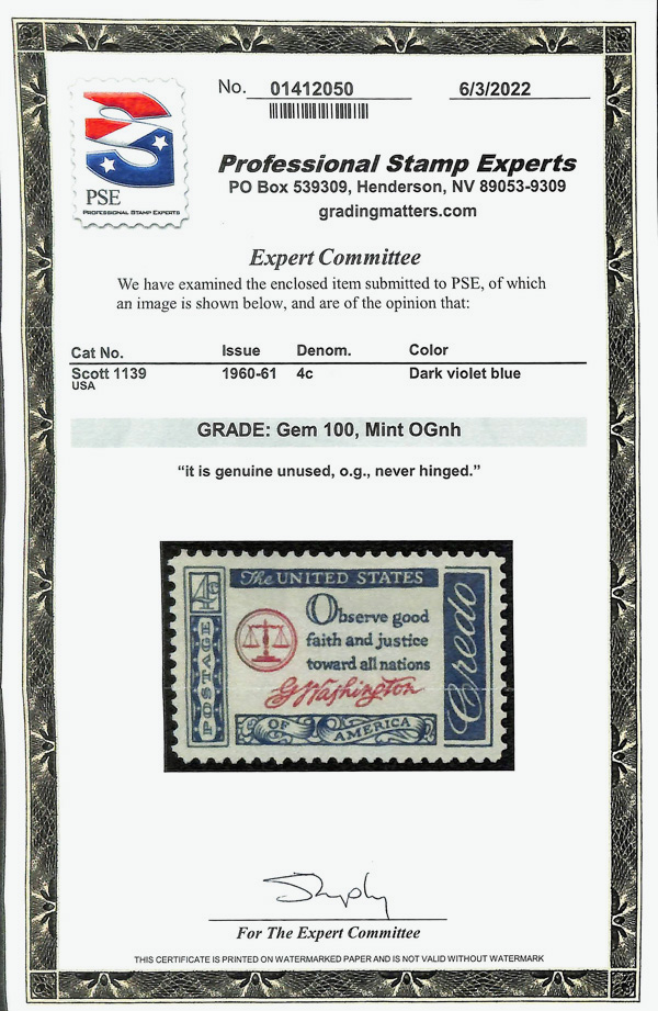 5683 nh 1139 image1960, 4¢ American Credo: Washington (Scott 1139), o.g., never hinged, Superb, with 2022 P.S.E. certificate graded GEM 100.