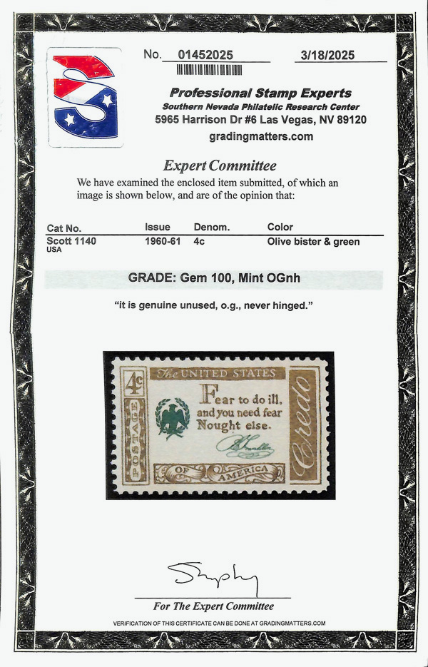 5684 nh 1140 image1960, 4¢ American Credo: Franklin (Scott 1140), o.g., never hinged, Superb, with 2025 P.S.E. certificate graded GEM 100.