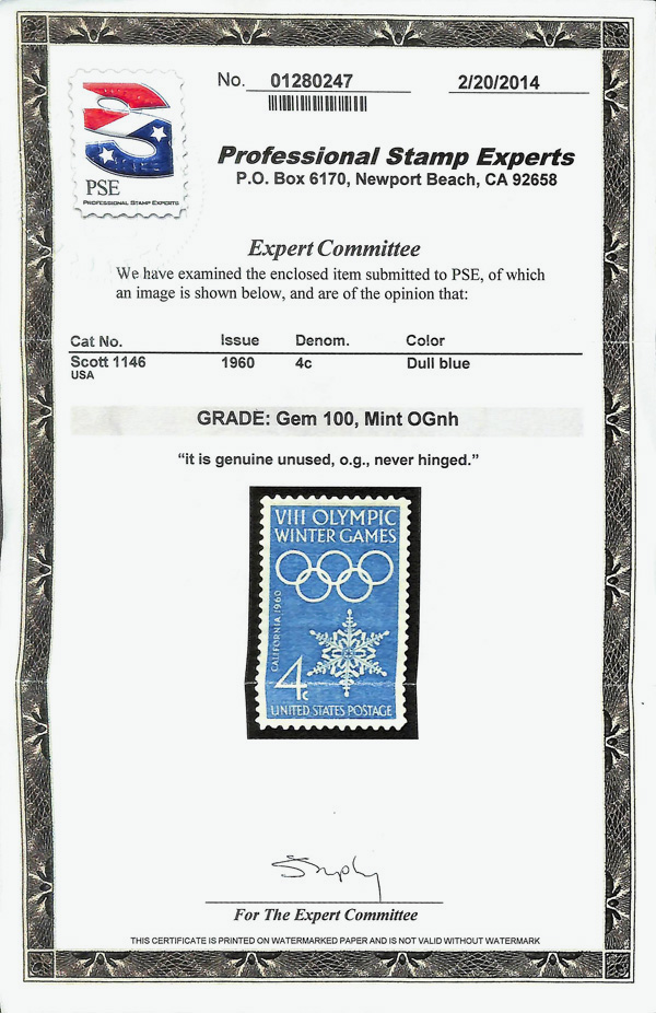 5685 nh 1146 image1960, 4¢ Winter Olympics (Scott 1146), o.g., never hinged, Superb, with 2014 P.S.E. certificate graded GEM 100.