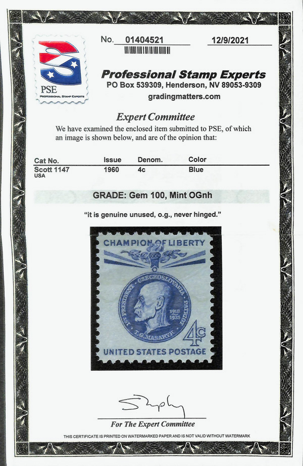 5686 nh 1147 image1960, 4¢ Champion of Liberty: Thomas Masaryk (Scott 1147), o.g., never hinged, Superb, with 2021 P.S.E. certificate graded GEM 100.
