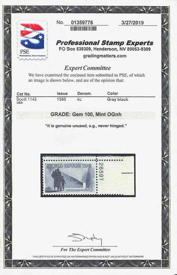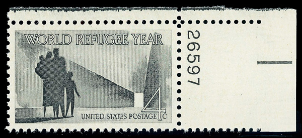 5687 nh 1149 image1960, 4¢ World Refugee Year (Scott 1149), plate number single, o.g., never hinged, Superb, with 2019 P.S.E. certificate graded GEM 100.