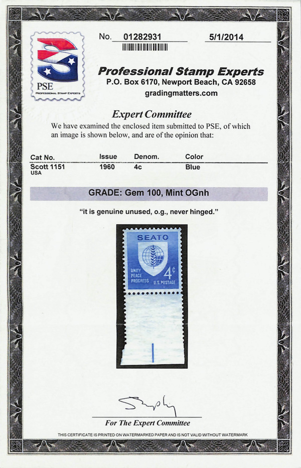 5688 nh 1151 image1960, 4¢ SEATO (Scott 1151), o.g., never hinged, Superb, with 2014 P.S.E. certificate graded GEM 100.
