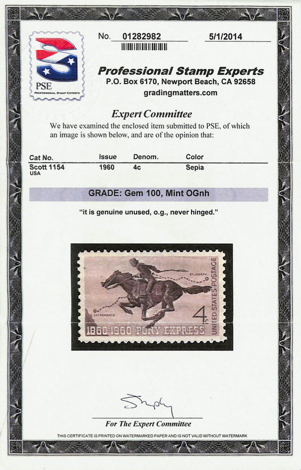 5689 nh 1154 image1960, 4¢ Pony Express (Scott 1154), o.g., never hinged, Superb, with 2014 P.S.E. certificate graded GEM 100.