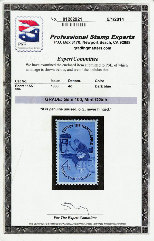 5690 nh 1155 image1960, 4¢ Employ the Handicapped (Scott 1155), o.g., never hinged, Superb, with 2014 P.S.E. certificate graded GEM 100.