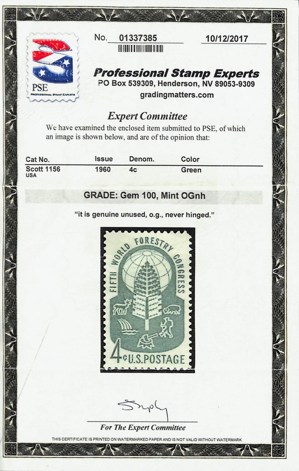 5691 nh 1156 image1960, 4¢ World Forestry Congress (Scott 1156), o.g., never hinged, Superb, with 2017 P.S.E. certificate graded GEM 100.