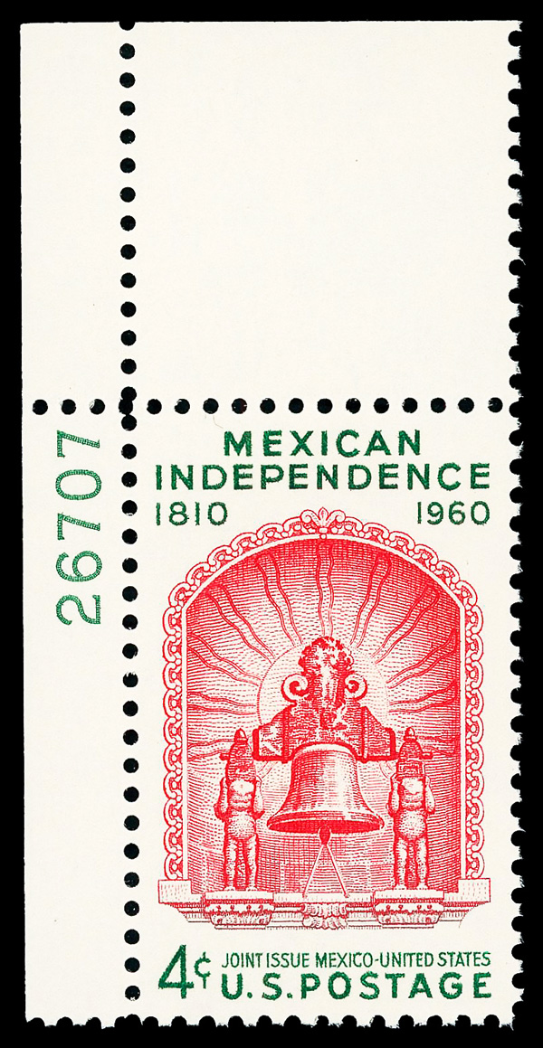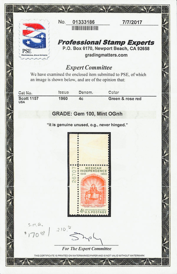 5692 nh 1157 image1960, 4¢ Mexican Independence (Scott 1157), plate number single, o.g., never hinged, Superb, with 2017 P.S.E. certificate graded GEM 100.