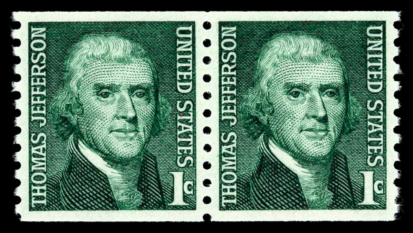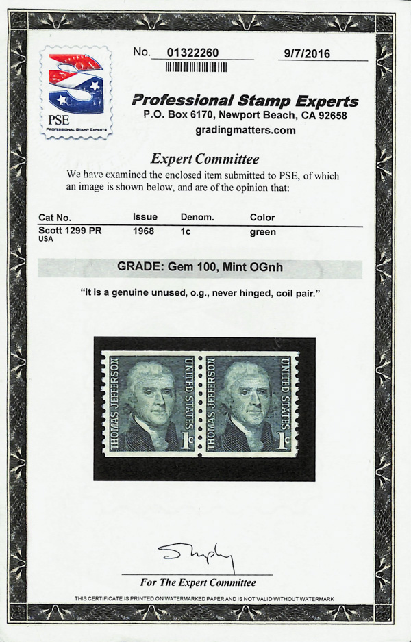 5706 nh 1299 image1968, 1¢ Jefferson, horizontal coil (Scott 1299), pair, o.g., never hinged, Superb, with 2016 P.S.E. certificate graded GEM 100.