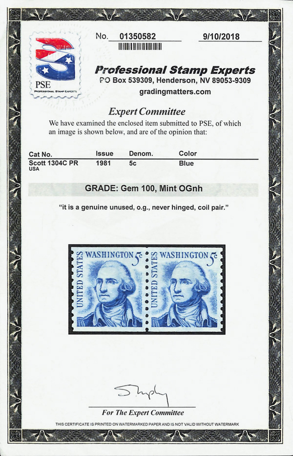 5708 nh 1304C image1981, 5¢ Washington, redrawn, horizontal coil (Scott 1304C), pair, o.g., never hinged, Superb, with 2018 P.S.E. certificate graded GEM 100.
