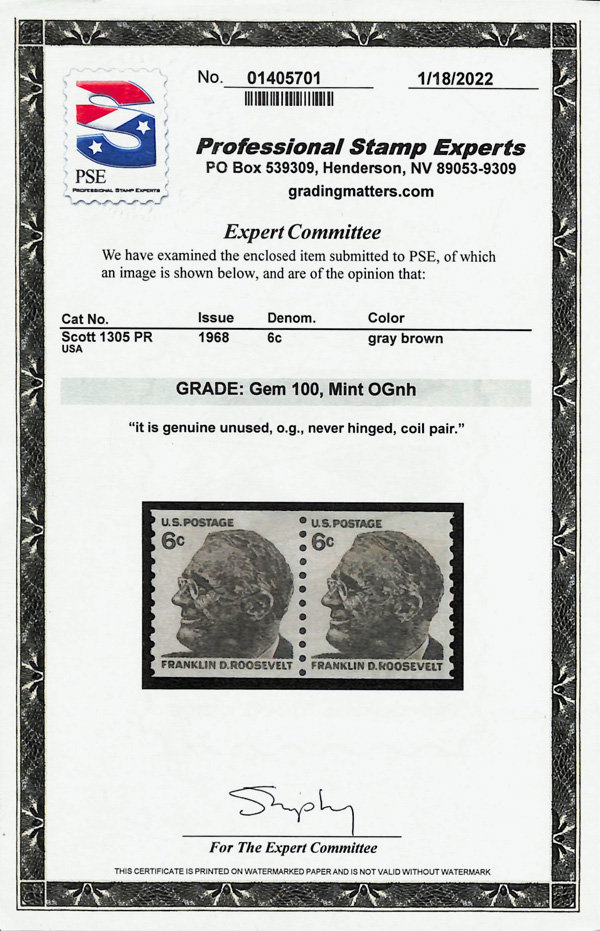 5710 nh 1305 image1968, 6¢ Franklin D. Roosevelt, horizontal coil (Scott 1305), pair, o.g., never hinged, Superb, with 2022 P.S.E. certificate graded GEM 100.