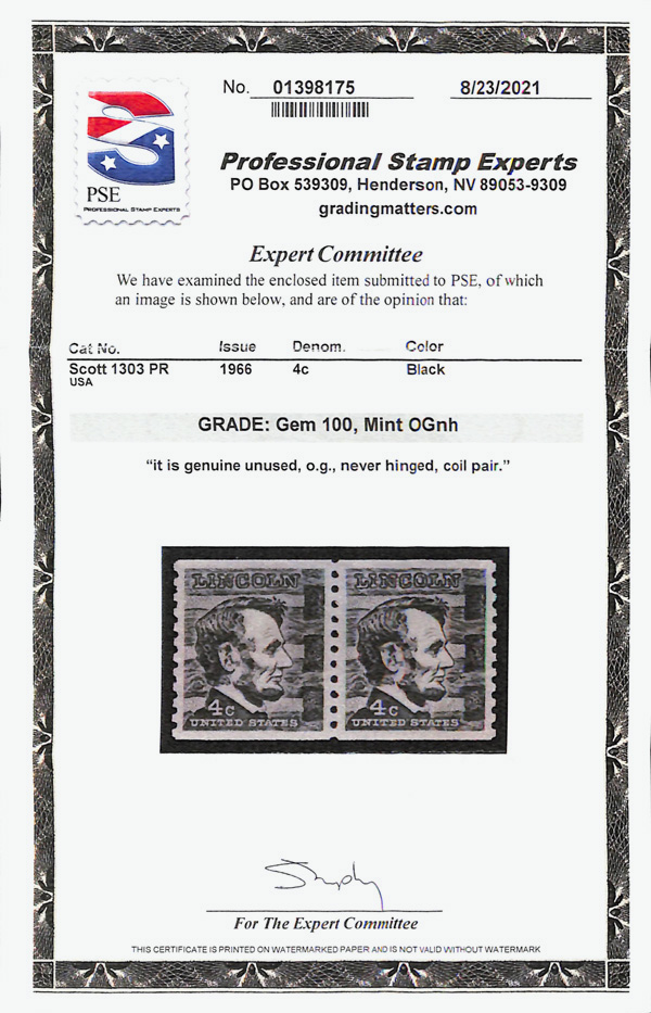 5707 nh 1303 image1966, 4¢ Lincoln, horizontal coil (Scott 1303), pair, o.g., never hinged, Superb, with 2021 P.S.E. certificate graded GEM 100.