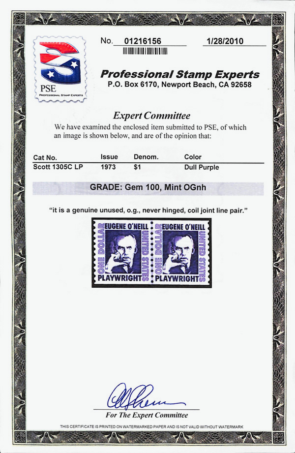 5711 og 1305C image1973, $1 Eugene O'Neill, horizontal coil (Scott 1305C), Superb, with 2010 P.S.E. certificate graded GEM 100.