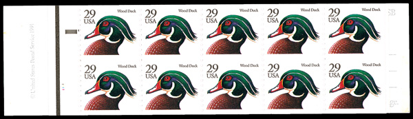 5719 BKnh 2484g image1991, 29¢ Wood Duck, black "29 USA", booklet pane of 10, imperf between (Scott 2484g), complete unexploded booklet with both panes the error, with perforations at top and bottom; clean and sound, o.g., never hinged, Very Fine.
