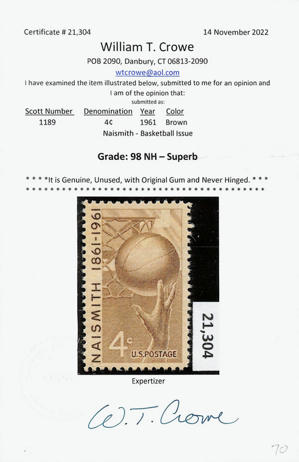 5695 nh 1189 image1961, 4¢ Naismith - Basketball (Scott 1189), o.g., never hinged, a slam-dunk buzzer-beater of a stamp, Superb, with 2022 Crowe certificate graded SUP 98.