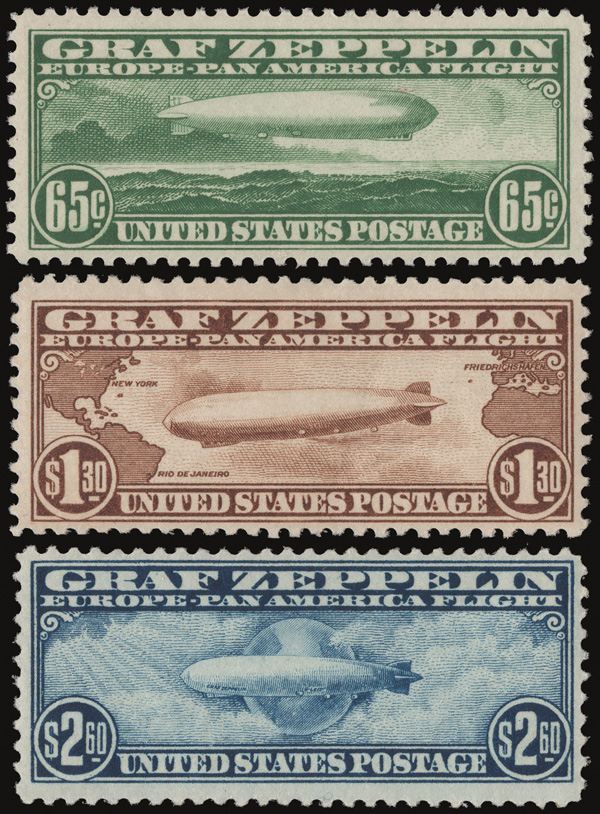 5732 og C13-C15 imageAirmail, 1930, Graf Zeppelin complete (Scott C13-C15), o.g., lightly hinged, Fine.
