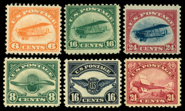 5722 og C1-C6 imageAirmail, 1918-23, First and Second Issues complete (Scott C1-C6), set of 6, o.g., hinged; #C1 & C4 thin, Fine to Very Fine.