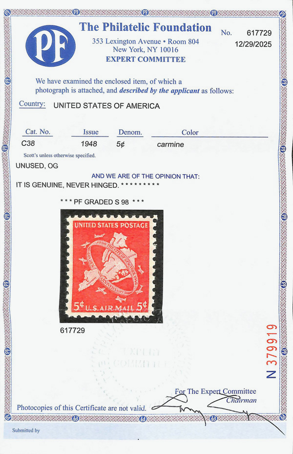 5747 nh C38 imageAirmail, 1948, 5¢ New York City (Scott C38), o.g., never hinged, Superb, with 2025 P.F. certificate graded SUP 98.