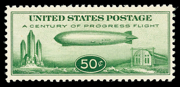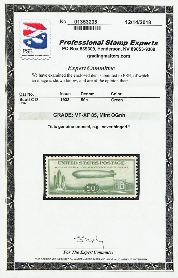 5736 nh C18 imageAirmail, 1933, 50¢ "Chicago" Zeppelin (Scott C18), o.g., never hinged, Very Fine to Extremely Fine, with 2018 P.S.E. certificate graded VF-XF 85.