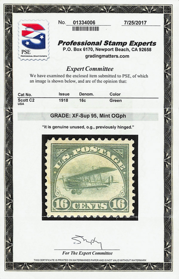 5724 og C2 imageAirmail, 1918, 16¢ green (Scott C2), o.g., hinged, Extremely Fine to Superb, with 2017 P.S.E. certificate graded XF-SUP 95.