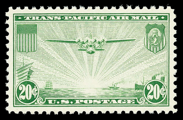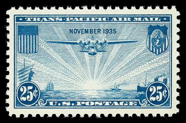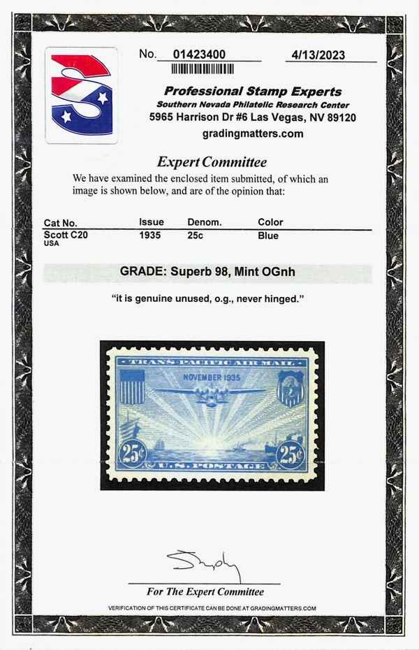 5737 nh C20 imageAirmail, 1935, 25¢ China Clipper (Scott C20), o.g., never hinged, Superb, with 2023 P.S.E. certificate graded SUP 98.