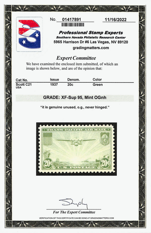 5738 nh C21 imageAirmail, 1937, 20¢ China Clipper (Scott C21), o.g., never hinged, Extremely Fine to Superb, with 2022 P.S.E. certificate graded XF-SUP 95.