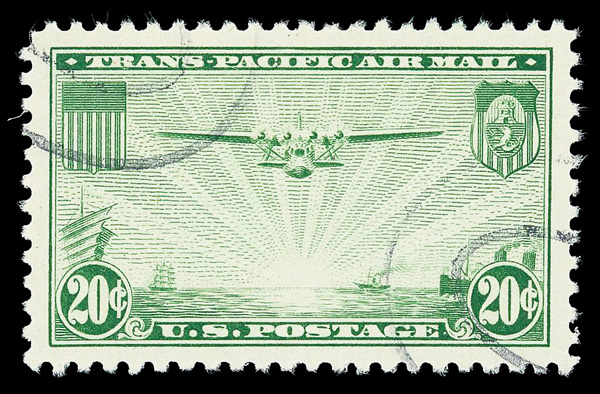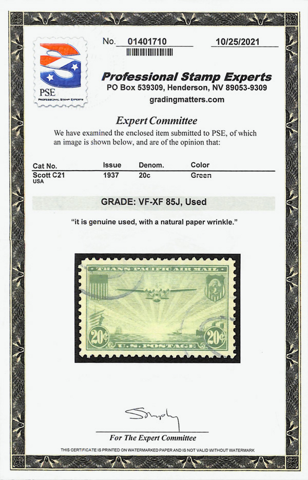 5739 O C21 imageAirmail, 1937, 20¢ China Clipper (Scott C21), jumbo margins, Very Fine to Extremely Fine, with 2021 P.S.E. certificate graded VF-XF 85J. (Image) (Image2) (All Images)