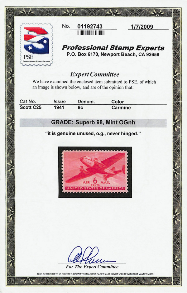 5741 nh C25 imageAirmail, 1941, 6¢ Transport (Scott C25), o.g., never hinged, Superb, with 2009 P.S.E. certificate graded SUP 98.