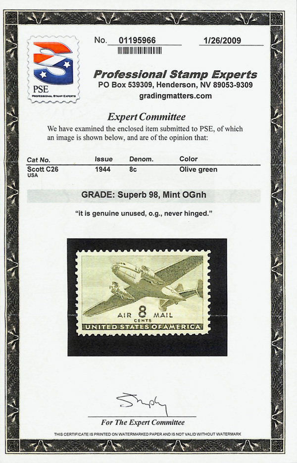 5742 nh C26 imageAirmail, 1944, 8¢ Transport (Scott C26), o.g., never hinged, Superb, with 2009 P.S.E. certificate graded SUP 98.