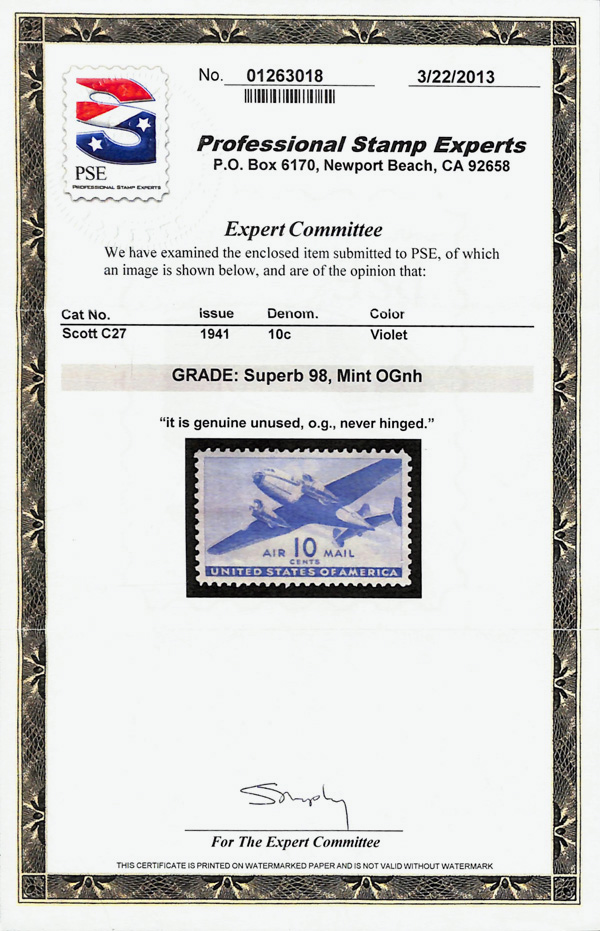 5743 nh C27 imageAirmail, 1941, 10¢ Transport (Scott C27), o.g., never hinged, Superb, with 2013 P.S.E. certificate graded SUP 98.