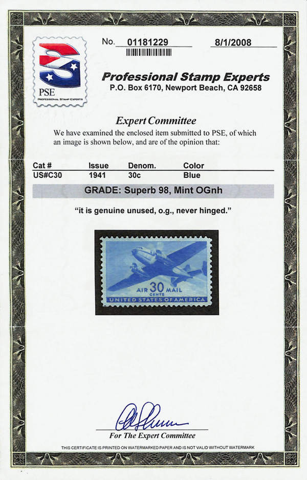 5744 nh C30 imageAirmail, 1941, 30¢ Transport (Scott C30), o.g., never hinged, Superb, with 2008 P.S.E. certificate graded SUP 98.