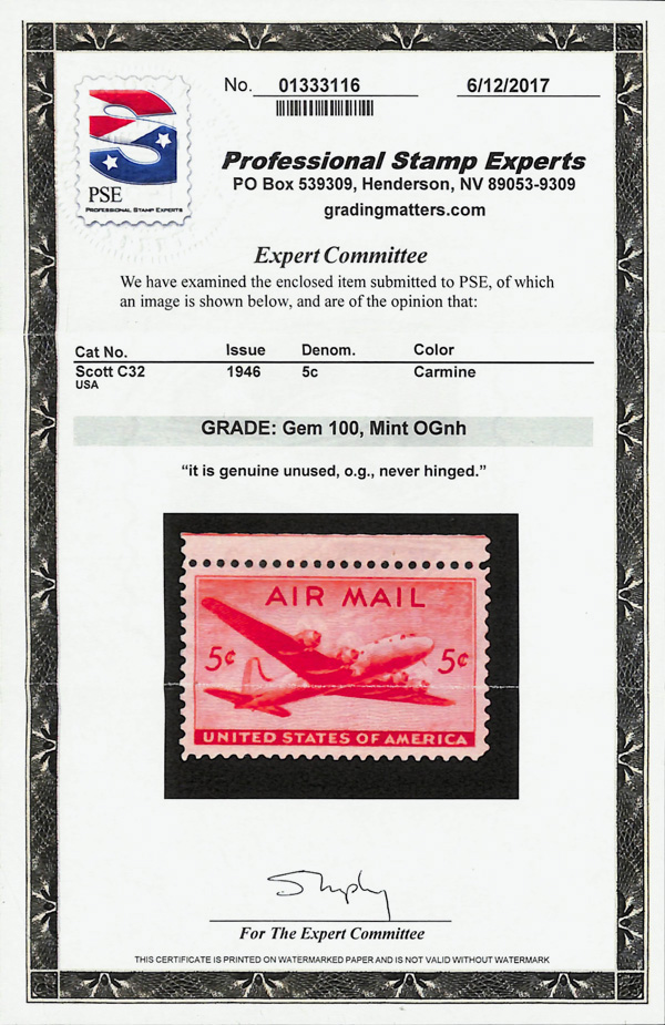 5745 nh C32 imageAirmail, 1946, 5¢ DC-4 Skymaster (Scott C32), o.g., never hinged, Superb, with 2017 P.S.E. certificate graded GEM 100.