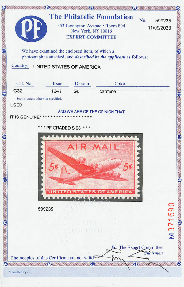 5746 O C32 imageAirmail, 1946, 5¢ DC-4 Skymaster (Scott C32), Superb, with 2023 P.S.E. certificate graded SUP 98.