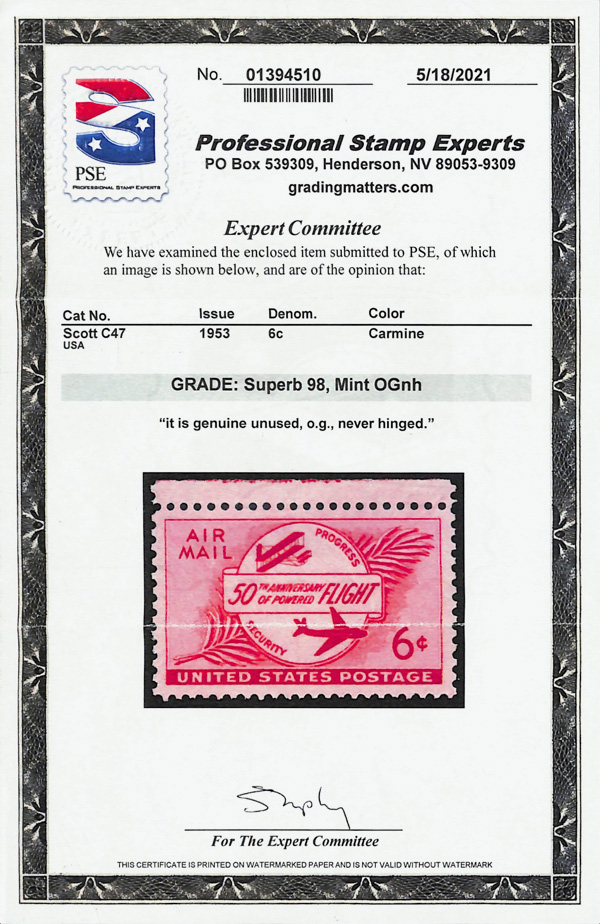 5748 nh C47 imageAirmail, 1953, 6¢ Powered Flight (Scott C47), o.g., never hinged, Superb, with 2021 P.S.E. certificate graded SUP 98.