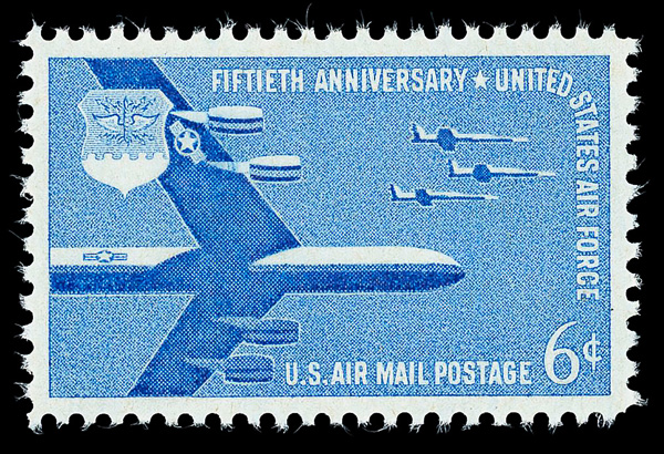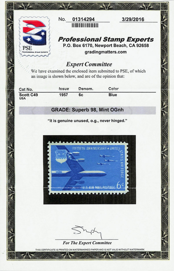 5749 nh C49 imageAirmail, 1957, 6¢ Air Force (Scott C49), o.g., never hinged, Superb, with 2016 P.S.E. certificate graded SUP 98.