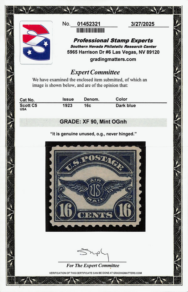 5729 nh C5 imageAirmail, 1923, 16¢ dark blue (Scott C5), o.g., never hinged, Extremely Fine, with 2025 P.S.E. certificate graded XF 90.